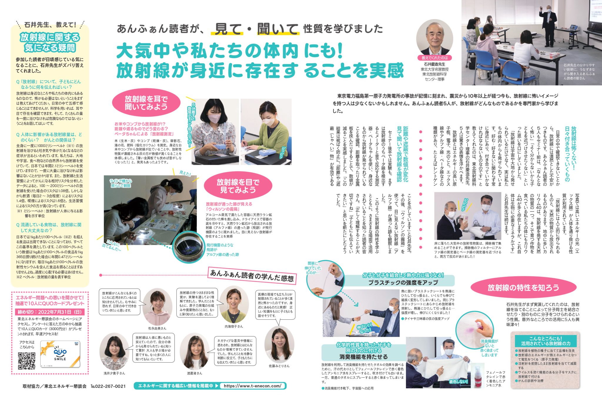 このたび当会では、「あんふぁん夏休み号7/8発行」にあんふぁん読者モニターを対象に実施した「放射線セミナー」の採録記事を掲載します。セミナーでは、東北大学名誉教授・東北放射線科学センター理事の石井 慶造 氏を講師に、放射線とはどんなものなのか、見て、測って、性質を学びました。