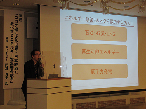 エコノミストでBRICs(ブリックス)経済研究所代表の門倉貴史氏を講師に、「コロナ禍による世界・日本経済と激化するエネルギー資源獲得競争」と題し、新型コロナウイルスの世界的な感染状況や国内外に与える経済の影響、東京五輪が中止になった場合の経済損失等について、具体的な数値を用いて説明いただきました。