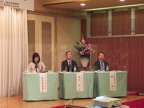 二部のパネルディスカッションでは、「エネルギーとともに考える 上越のこれから」をテーマに、松本氏、上越市歴史博物館の荒川学芸員、十日町で旅館を営む柳社長の3名がパネリストとして登壇。上越地域における石油の採掘や関川水系を利用した水力発電が原動力となりインフラ、産業が発展した歴史や温泉を利用しエネルギー事業に取り組む現状などについて語り、地域エネルギーの活用や上越の将来性などについて考える契機となる提言をしていただきました。