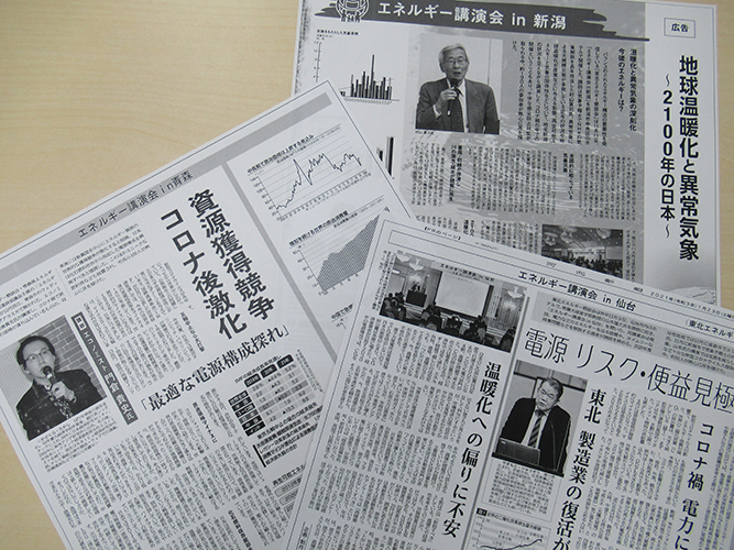 「エネルギー講演会」講演録を新聞に掲載しました 2021.02.05|ニュース 2020年度、青森市、新潟市、仙台市で開催した当会主催の「エネルギー講演会」について、東奥日報、新潟日報、河北新報の3紙に講演録を掲載しました。 下記、各講演会の詳細より、採録記事をご覧いただけます。 ■「エネルギー講演会in青森」 (詳細はこちら) 2020年12月12日付 東奥日報朝刊掲載 ■「エネルギー講演会in新潟」 (詳細はこちら) 2020年12月20日付 新潟日報朝刊掲載 ■「エネルギー講演会in仙台」 (詳細はこちら) 2021年1月23日付 河北新報朝刊掲載