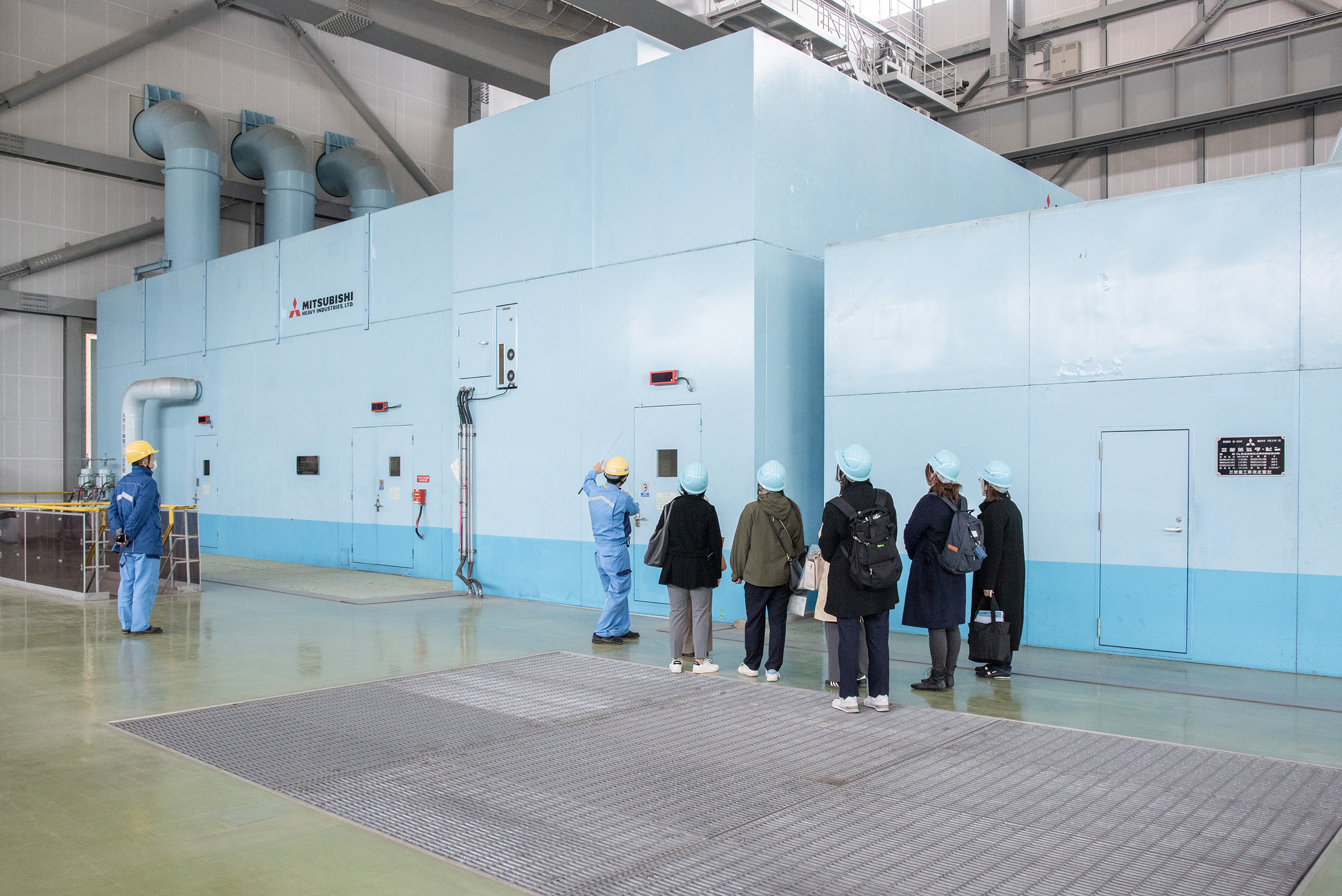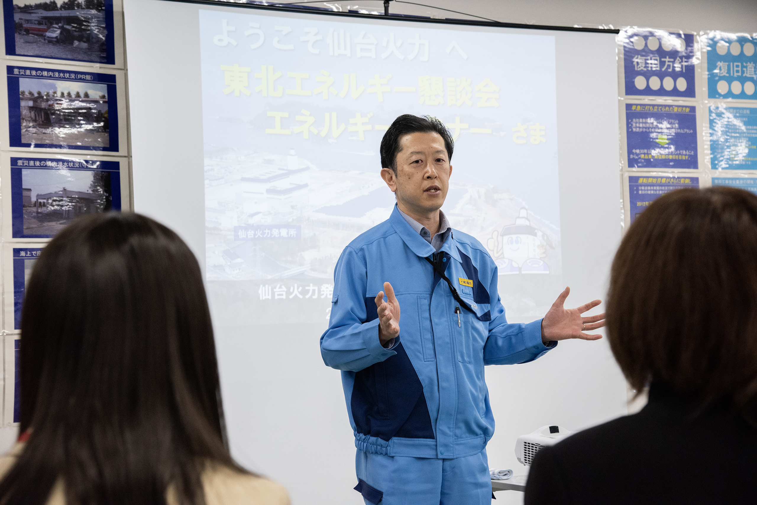 2回目(3/13)は、東北電力(株)仙台火力発電所・仙台太陽光発電所を見学しました。発電所は特別名勝・松島の一部に含まれる立地であることから、景観に配慮し白壁と瓦葺屋根からなる「蔵」をイメージした和風の外観になっています。そして、効率よく電気を作るコンバインドサイクル発電により、世界最高クラスの熱効率を実現している特徴などについて学習しました。