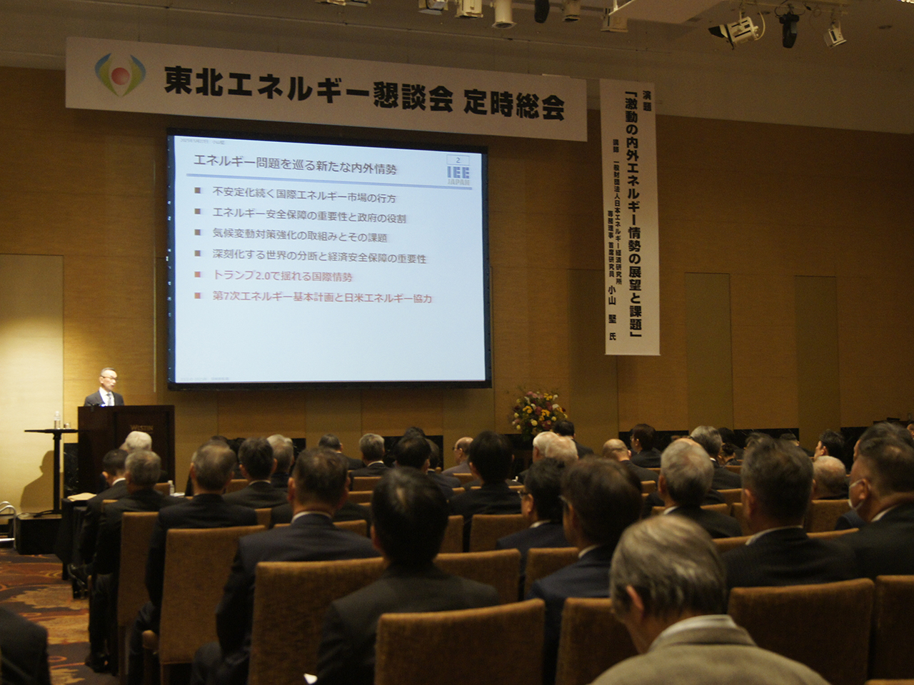 総会後には、一般財団法人 日本エネルギー経済研究所 専務理事 首席研究員 小山 堅 氏による「激動の内外エネルギー情勢の展望と課題」と題した講演会を開催しました。小山氏は、ウクライナ侵攻にともなう国際エネルギー市場の不安定化と脱炭素化への影響、トランプ2.0と深刻化する世界の分断、第7次エネルギー基本計画やエネルギー安全保障の重要性について、詳細なデータを交えて解説。その上で、「世界のエネルギー関係者は、現在運転を停止している日本の原子力発電所の再稼働について、世界的な再生可能エネルギーへの取り組みや米国を中心としたLNG開発と同様に、世界のエネルギー情勢に大きな影響を与える事象として注視している」と指摘しました。