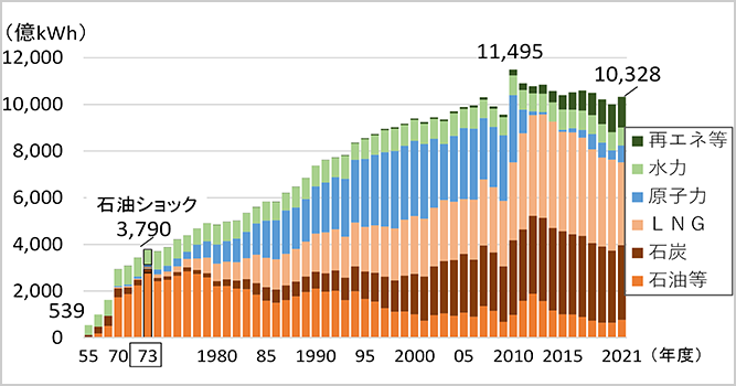 16. 発電電力量とその割合の推移(1955年~2021年)