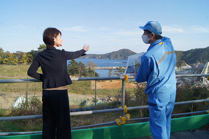 防潮堤を間近で見上げるとその巨大さに圧倒されます。海抜29メートル、全長約800メートルにも及ぶ壁は、一度完成となるも「新たなリスクの視点」が指摘されたことで再び作り直しているとのこと。万が一の安全対策に終わりはない、を目の当たりにしました。